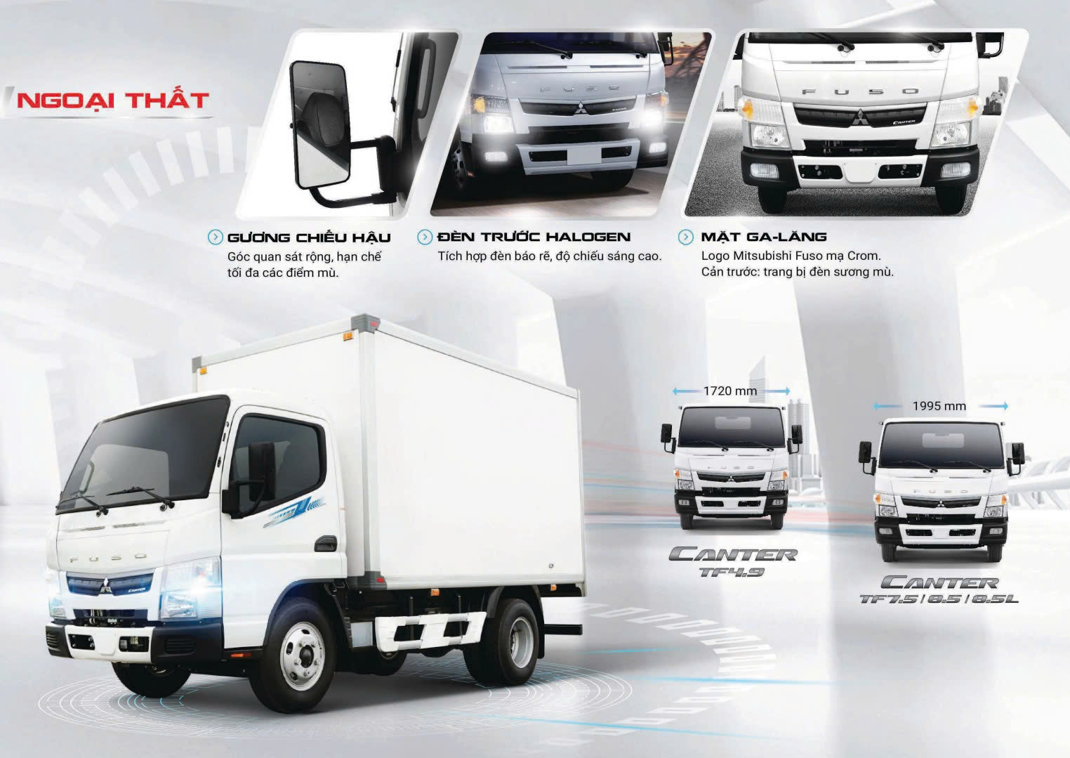 Mitsubishi Fuso Canter TF4.9 (tải trọng 1.995 tấn) là dòng xe tải trung cao cấp hoàn toàn mới từ Mitsubishi Nhật Bản, được sản xuất và phân phối độc quyền tại Việt Nam. Mitsubishi Fuso Canter TF4.9 sở hữu các tính năng công nghệ nổi bật nhất trong phân khúc: động cơ Mitsubishi Fuso đạt tiêu chuẩn khí thải Euro 5, hệ thống chống bó cứng phanh ABS và hệ thống phân bổ lực phanh điện tử EBD. Mitsubishi Fuso Canter TF4.9 linh hoạt đáp ứng nhu cầu chuyên chở của khách hàng với đa dạng thùng tải: Thùng tải lửng, Thùng mui bạt, Thùng tải kín, Thùng đông lạnh, Thùng bán hàng lưu động… |