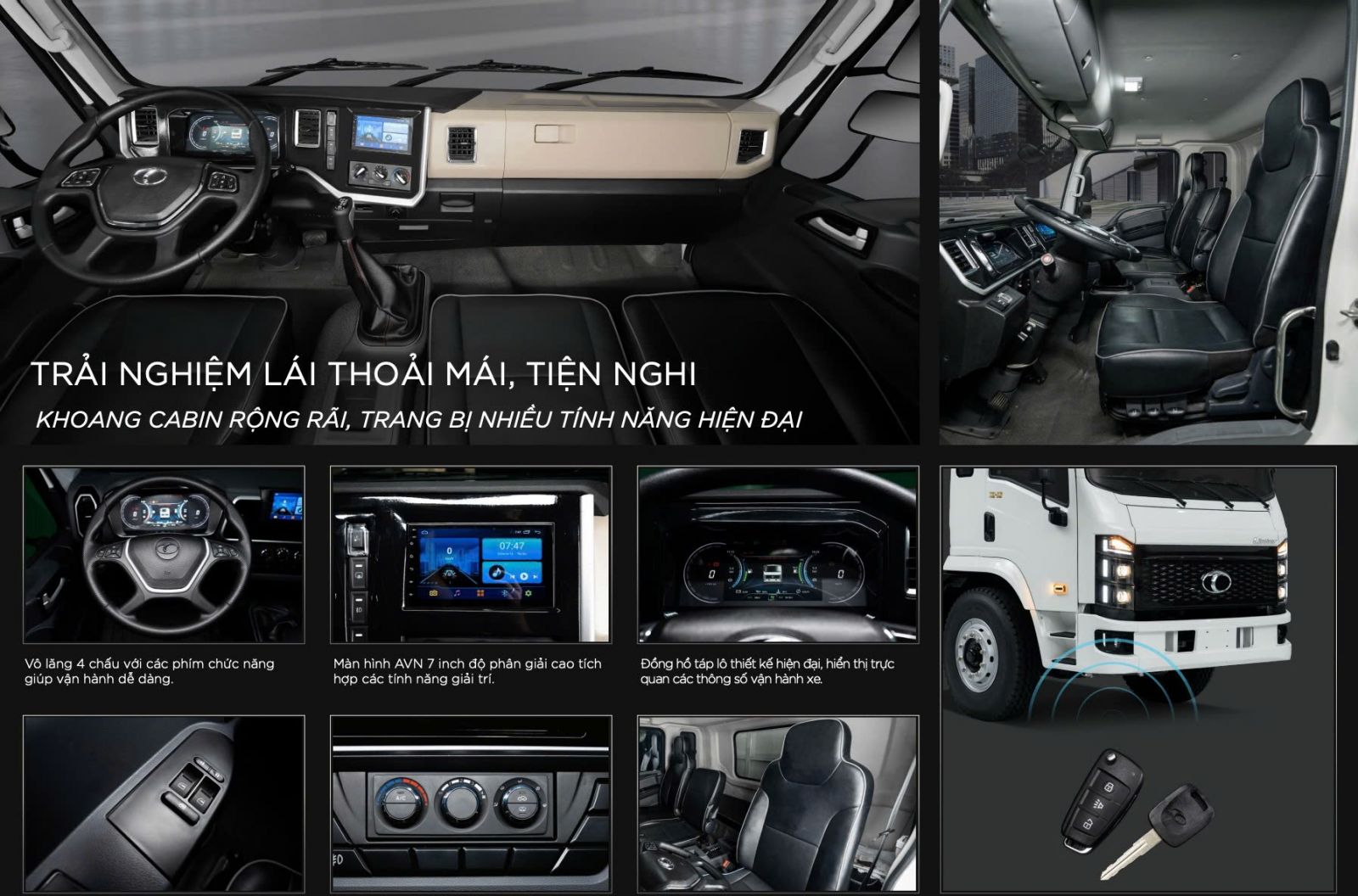 Không gian cabin được thiết kế rộng rãi, hiện đại, hướng đến trải nghiệm của người lái trong suốt quá trình di chuyển Ghế bọc nệm cao cấp chống bám bẩn, dễ vệ sinh, kết hợp viền chỉ xanh nổi bật, tăng tính thẩm mỹ, form ghế ngồi rộng rãi, thoải mái Vô lăng 4 chấu với các phím chức năng, giúp vận hành dễ dàng Trang bị màn hình LCD 7 inch, hiển thị trực quan, đầy đủ thông tin về tình trạng hoạt động của xe, thuận tiện cho khách hàng. Đồng hồ điều khiển táp lô tích hợp màn hình LCD 7’’. Điều hòa 2 chiều với 2 chức năng sưởi ấm và làm lạnh |